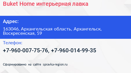 Buket Home, интерьерная лавка по адресу 163046, Архангельская область, Архангельск, Воскресенская, 59 в дальнейшем Организация, размещена в следующих категориях: