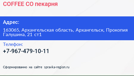 COFFEE CO, пекарня по адресу 163065, Архангельская область, Архангельск, Прокопия Галушина, 21 ст1 в дальнейшем Организация, размещена в следующих категориях: