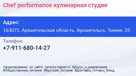 Chef performance, кулинарная студия по адресу 163071, Архангельская область, Архангельск, Тимме, 25 в дальнейшем Организация, размещена в следующих категориях: