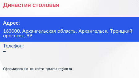 Династия, столовая по адресу 163000, Архангельская область, Архангельск, Троицкий проспект, 99 в дальнейшем Организация, размещена в следующих категориях: