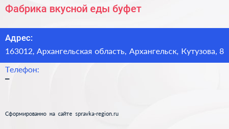 Фабрика вкусной еды, буфет по адресу 163012, Архангельская область, Архангельск, Кутузова, 8 в дальнейшем Организация, размещена в следующих категориях: