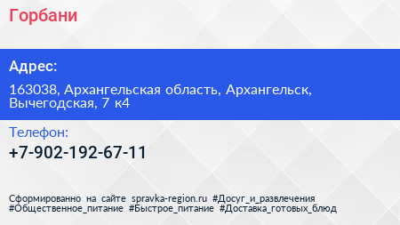 Горбани по адресу 163038, Архангельская область, Архангельск, Вычегодская, 7 к4 в дальнейшем Организация, размещена в следующих категориях: