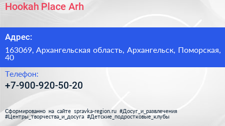 Hookah Place Arh по адресу 163069, Архангельская область, Архангельск, Поморская, 40 в дальнейшем Организация, размещена в следующих категориях: