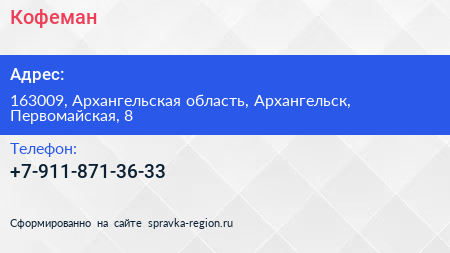 Кофеман по адресу 163009, Архангельская область, Архангельск, Первомайская, 8 в дальнейшем Организация, размещена в следующих категориях: