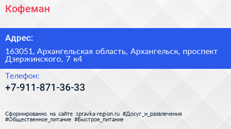 Кофеман по адресу 163051, Архангельская область, Архангельск, проспект Дзержинского, 7 к4 в дальнейшем Организация, размещена в следующих категориях: