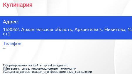 Кулинария по адресу 163062, Архангельская область, Архангельск, Никитова, 12 ст1 в дальнейшем Организация, размещена в следующих категориях: