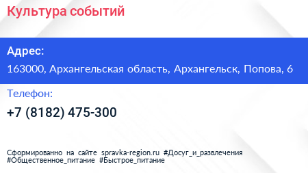 Культура событий по адресу 163000, Архангельская область, Архангельск, Попова, 6 в дальнейшем Организация, размещена в следующих категориях: