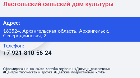 Ластольский сельский дом культуры по адресу 163524, Архангельская область, Архангельск, Северодвинская, 2 в дальнейшем Организация, размещена в следующих категориях: