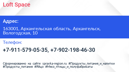 Loft Space по адресу 163001, Архангельская область, Архангельск, Вологодская, 10 в дальнейшем Организация, размещена в следующих категориях: