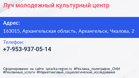 Луч, молодежный культурный центр по адресу 163015, Архангельская область, Архангельск, Чкалова, 2 в дальнейшем Организация, размещена в следующих категориях:
