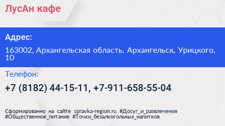 ЛусАн, кафе по адресу 163002, Архангельская область, Архангельск, Урицкого, 10 в дальнейшем Организация, размещена в следующих категориях: