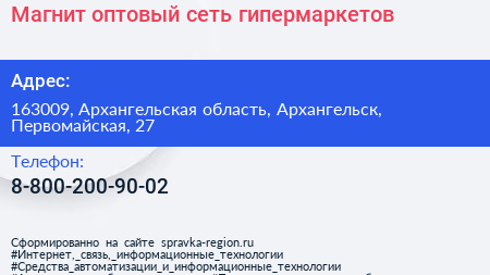 Магнит оптовый, сеть гипермаркетов по адресу 163009, Архангельская область, Архангельск, Первомайская, 27 в дальнейшем Организация, размещена в следующих категориях: