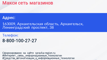 Макси, сеть магазинов по адресу 163009, Архангельская область, Архангельск, Ленинградский проспект, 38 в дальнейшем Организация, размещена в следующих категориях: