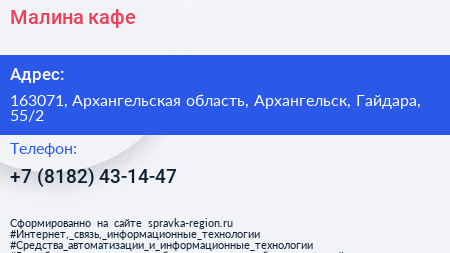 Малина, кафе по адресу 163071, Архангельская область, Архангельск, Гайдара, 55/2 в дальнейшем Организация, размещена в следующих категориях: