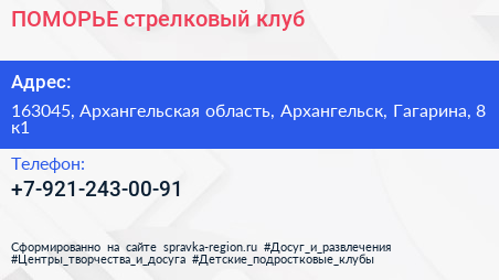 ПОМОРЬЕ, стрелковый клуб по адресу 163045, Архангельская область, Архангельск, Гагарина, 8 к1 в дальнейшем Организация, размещена в следующих категориях: