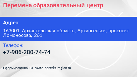 Перемена, образовательный центр по адресу 163001, Архангельская область, Архангельск, проспект Ломоносова, 261 в дальнейшем Организация, размещена в следующих категориях: