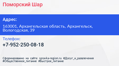 Поморский Шар по адресу 163001, Архангельская область, Архангельск, Вологодская, 39 в дальнейшем Организация, размещена в следующих категориях: