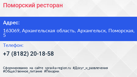 Поморский, ресторан по адресу 163069, Архангельская область, Архангельск, Поморская, 5 в дальнейшем Организация, размещена в следующих категориях: