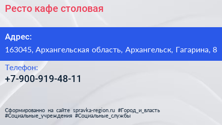 Ресто, кафе-столовая по адресу 163045, Архангельская область, Архангельск, Гагарина, 8 в дальнейшем Организация, размещена в следующих категориях:
