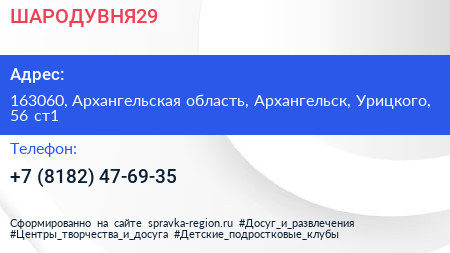 ШАРОДУВНЯ29 по адресу 163060, Архангельская область, Архангельск, Урицкого, 56 ст1 в дальнейшем Организация, размещена в следующих категориях: