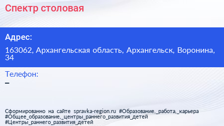 Спектр, столовая по адресу 163062, Архангельская область, Архангельск, Воронина, 34 в дальнейшем Организация, размещена в следующих категориях: