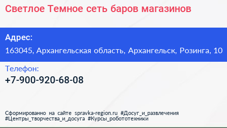 Светлое & Темное, сеть баров-магазинов по адресу 163045, Архангельская область, Архангельск, Розинга, 10 в дальнейшем Организация, размещена в следующих категориях: