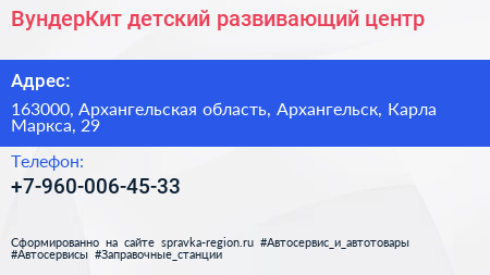 ВундерКит, детский развивающий центр по адресу 163000, Архангельская область, Архангельск, Карла Маркса, 29 в дальнейшем Организация, размещена в следующих категориях: