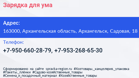 Зарядка для ума по адресу 163000, Архангельская область, Архангельск, Садовая, 18 в дальнейшем Организация, размещена в следующих категориях: