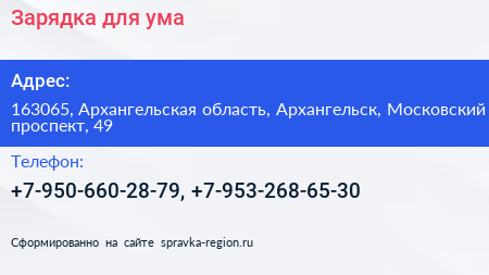 Зарядка для ума по адресу 163065, Архангельская область, Архангельск, Московский проспект, 49 в дальнейшем Организация, размещена в следующих категориях: