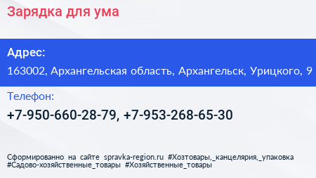 Зарядка для ума по адресу 163002, Архангельская область, Архангельск, Урицкого, 9 в дальнейшем Организация, размещена в следующих категориях: