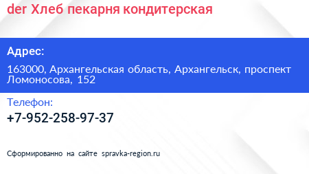 der Хлеб, пекарня-кондитерская по адресу 163000, Архангельская область, Архангельск, проспект Ломоносова, 152 в дальнейшем Организация, размещена в следующих категориях: