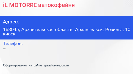 iL MOTORRE, автокофейня по адресу 163045, Архангельская область, Архангельск, Розинга, 10 киоск в дальнейшем Организация, размещена в следующих категориях: