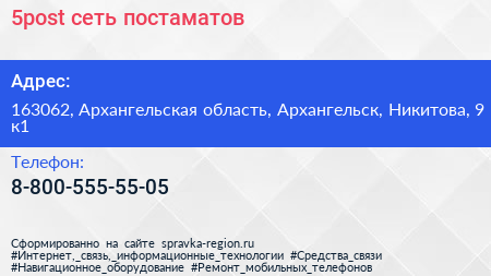 5post, сеть постаматов по адресу 163062, Архангельская область, Архангельск, Никитова, 9 к1 в дальнейшем Организация, размещена в следующих категориях: