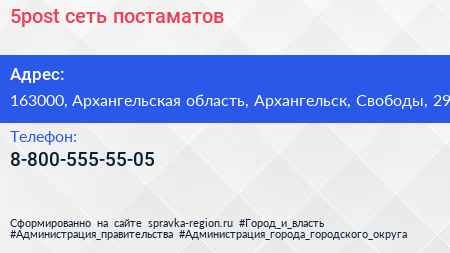 5post, сеть постаматов по адресу 163000, Архангельская область, Архангельск, Свободы, 29 в дальнейшем Организация, размещена в следующих категориях:
