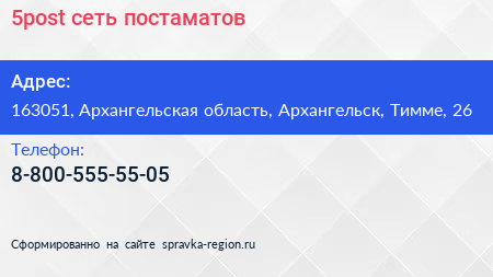 5post, сеть постаматов по адресу 163051, Архангельская область, Архангельск, Тимме, 26 в дальнейшем Организация, размещена в следующих категориях: