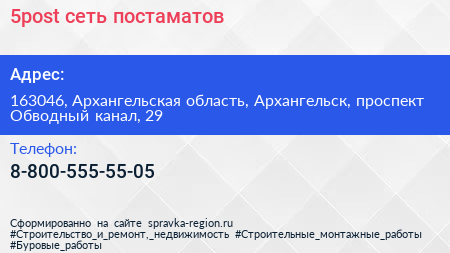5post, сеть постаматов по адресу 163046, Архангельская область, Архангельск, проспект Обводный канал, 29 в дальнейшем Организация, размещена в следующих категориях: