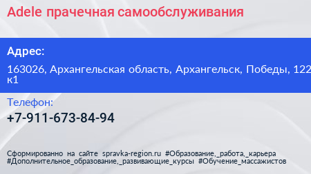Adele, прачечная самообслуживания по адресу 163026, Архангельская область, Архангельск, Победы, 122 к1 в дальнейшем Организация, размещена в следующих категориях: