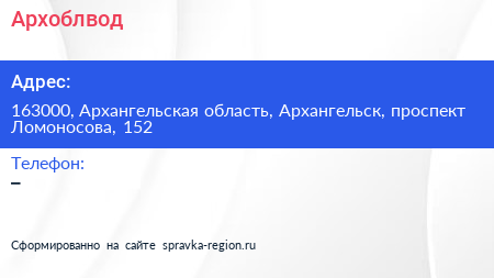 Архоблвод по адресу 163000, Архангельская область, Архангельск, проспект Ломоносова, 152 в дальнейшем Организация, размещена в следующих категориях: