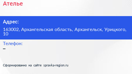 Ателье по адресу 163002, Архангельская область, Архангельск, Урицкого, 10 в дальнейшем Организация, размещена в следующих категориях: