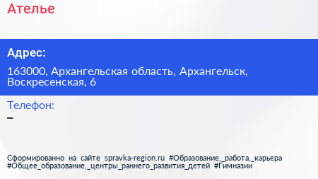 Ателье по адресу 163000, Архангельская область, Архангельск, Воскресенская, 6 в дальнейшем Организация, размещена в следующих категориях: