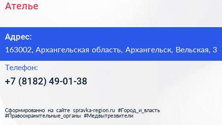 Ателье по адресу 163002, Архангельская область, Архангельск, Вельская, 3 в дальнейшем Организация, размещена в следующих категориях: