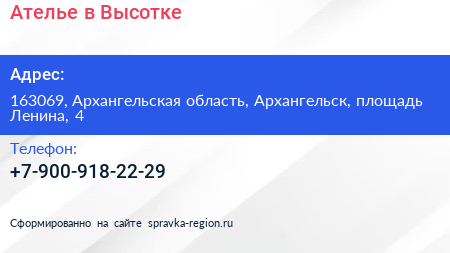 Ателье в Высотке по адресу 163069, Архангельская область, Архангельск, площадь Ленина, 4 в дальнейшем Организация, размещена в следующих категориях: