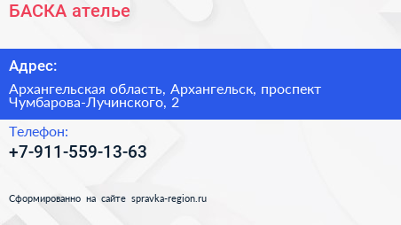 БАСКА, ателье по адресу Архангельская область, Архангельск, проспект Чумбарова-Лучинского, 2 в дальнейшем Организация, размещена в следующих категориях: