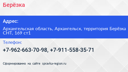 Берёзка по адресу Архангельская область, Архангельск, территория Берёзка СНТ, 169 ст1 в дальнейшем Организация, размещена в следующих категориях: