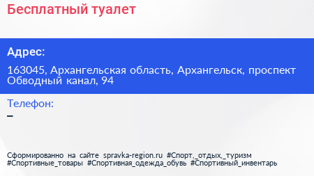 Бесплатный туалет по адресу 163045, Архангельская область, Архангельск, проспект Обводный канал, 94 в дальнейшем Организация, размещена в следующих категориях: