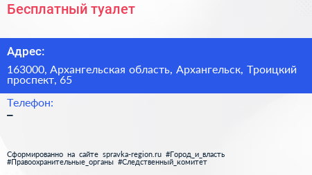 Бесплатный туалет по адресу 163000, Архангельская область, Архангельск, Троицкий проспект, 65 в дальнейшем Организация, размещена в следующих категориях: