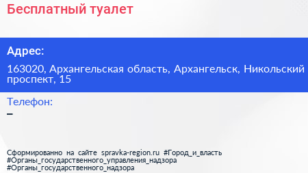 Бесплатный туалет по адресу 163020, Архангельская область, Архангельск, Никольский проспект, 15 в дальнейшем Организация, размещена в следующих категориях: