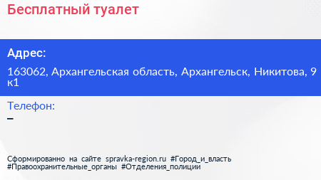 Бесплатный туалет по адресу 163062, Архангельская область, Архангельск, Никитова, 9 к1 в дальнейшем Организация, размещена в следующих категориях:
