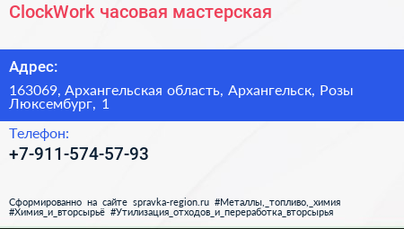 ClockWork, часовая мастерская по адресу 163069, Архангельская область, Архангельск, Розы Люксембург, 1 в дальнейшем Организация, размещена в следующих категориях: