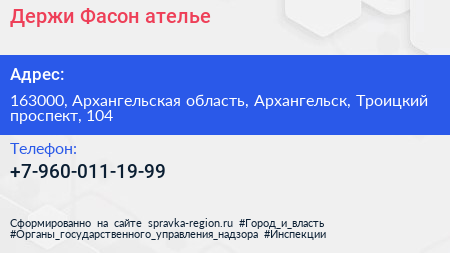 Держи Фасон, ателье по адресу 163000, Архангельская область, Архангельск, Троицкий проспект, 104 в дальнейшем Организация, размещена в следующих категориях: